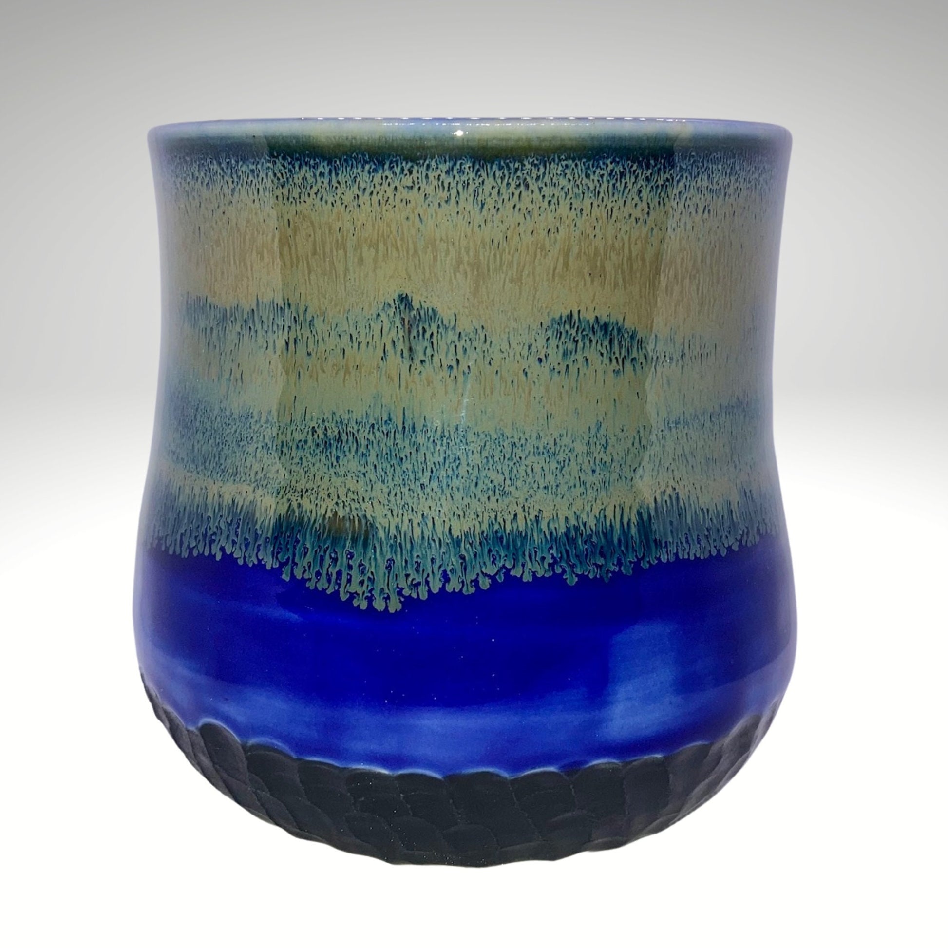 Wheel thrown, carved, then decorated with a variety of food safe glazes. The black matte glaze on the bottom makes the cobalt blue stand out under the layered glazes on the top half.