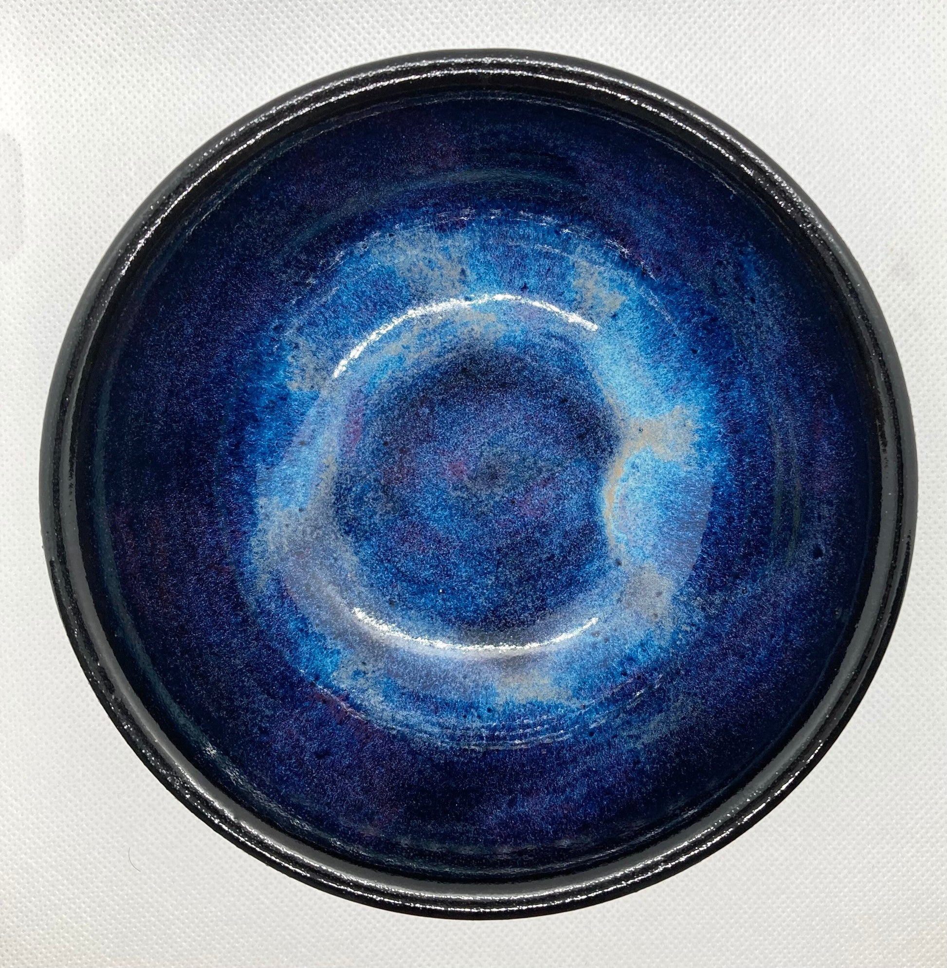 A cute little dish for your favorite snacks! I've glazed the inside with a stoned denim glaze and the outside with a black matte glaze.