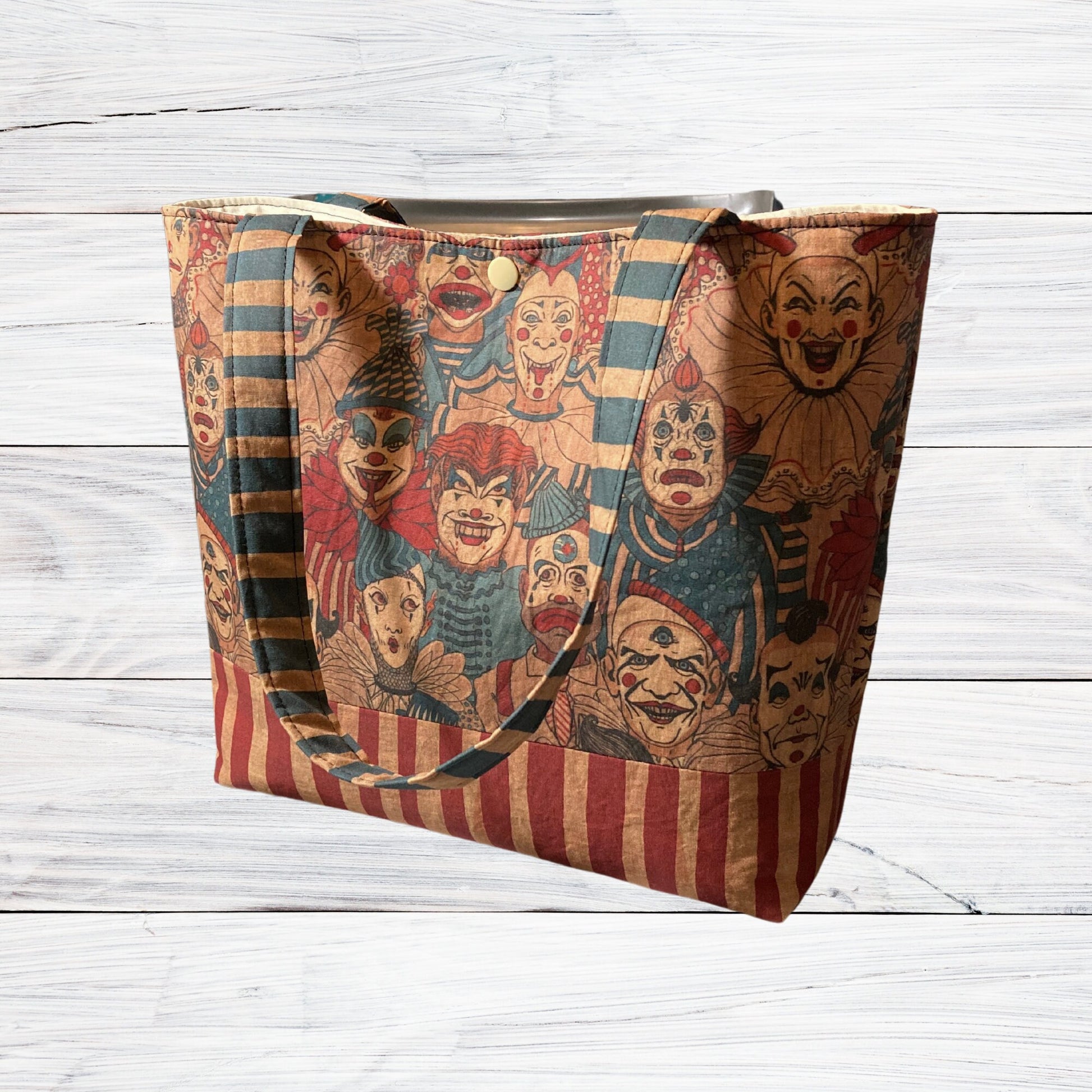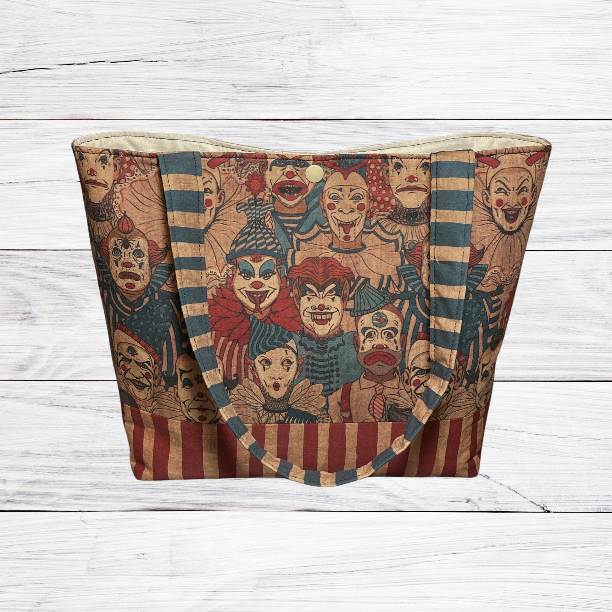 This creepy clown bag is fully lined and reinforced with cotton interfacing for shape and durability. The interior features two matching pockets, and it closes with a secure plastic snap.
