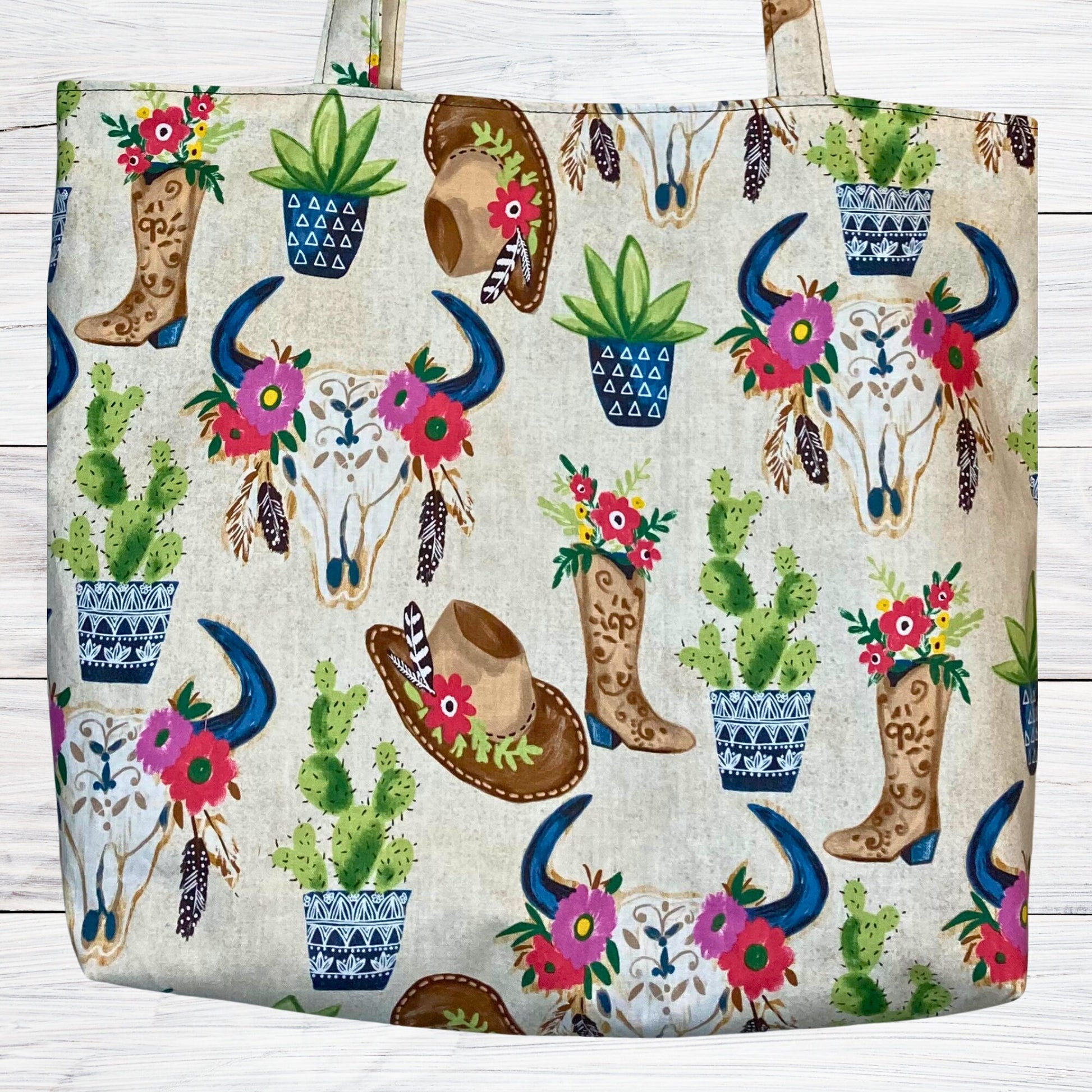 This double layered cotton fabric tote bag measures 13" wide by 12.25" tall by 3.5" deep with 25" shoulder straps.